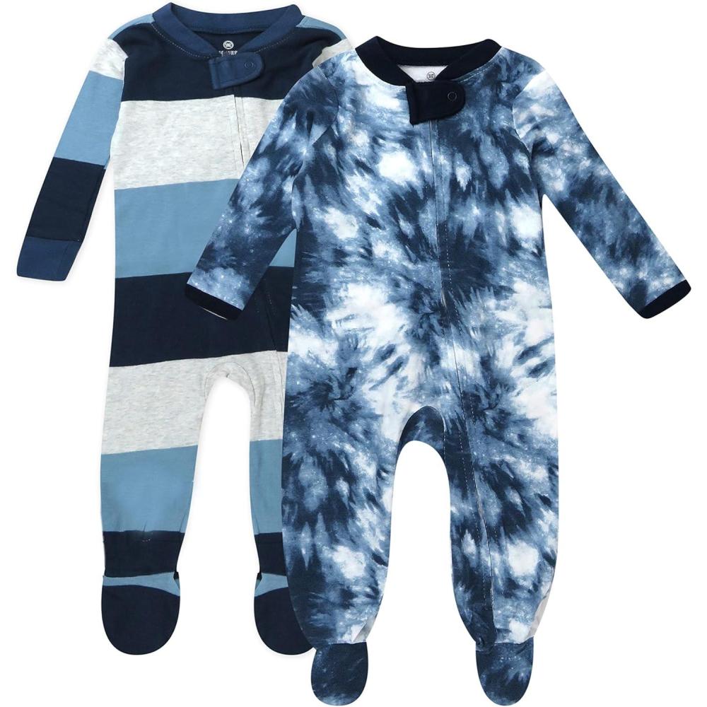 HonestBaby Baby Sleep N’ Play One-Piece Zip-Front Footed Organic Cotton Pajama Sleeper(2-pack Jumbo Ombre Stripe Blue Indigo)