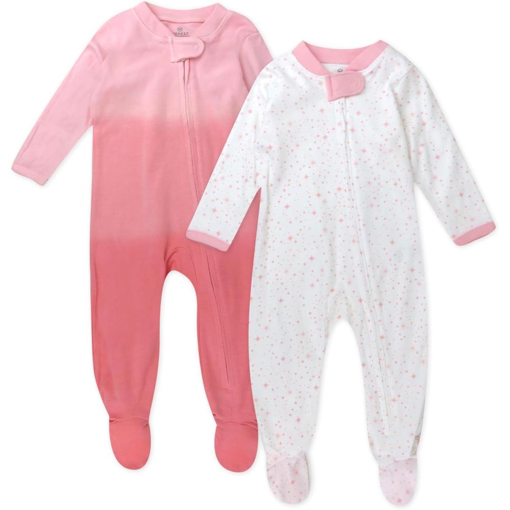 HonestBaby Sleep and Play Footed Pajamas One-Piece Sleeper Jumpsuit Zip-Front PJs 100% Organic Cotton for Baby Girls(2-pack Twinkle Star White/Pink)